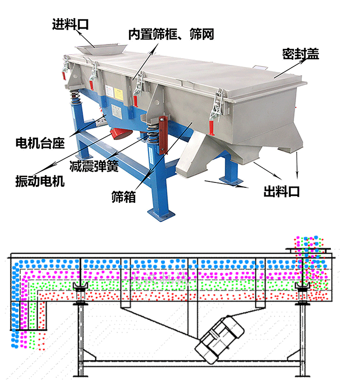 直線篩直線振動(dòng)篩是一樣的產(chǎn)品其結(jié)構(gòu)可簡單分為:進(jìn)料口、篩機(jī)蓋、篩板、出料口、彈簧和電機(jī)。