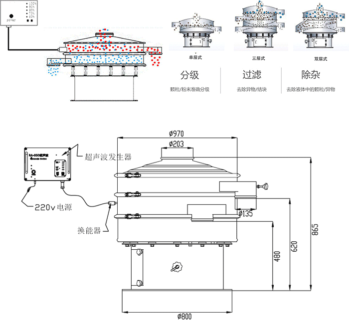 大漢振動篩廠家研發(fā)的超聲波振動篩解決強吸附性、易團聚、高靜電、高精細、高密度、輕比重等篩分難題,具有優(yōu)越的性能!在超聲波振動篩的性能上實現(xiàn)大的突破。篩分精度可提高1-100%,產量可提高1-10倍;真正滿足500目以上工業(yè)化生產需要。