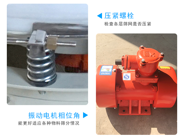 ⑶開(kāi)機(jī)前,應(yīng)先檢查各壓緊螺栓的緊固程度,及各料口的位置是否與接料器對(duì)正,并觀察振動(dòng)電機(jī)是否能正常轉(zhuǎn)動(dòng)及彈簧受力有無(wú)阻礙,檢查各層篩網(wǎng)是否壓緊。