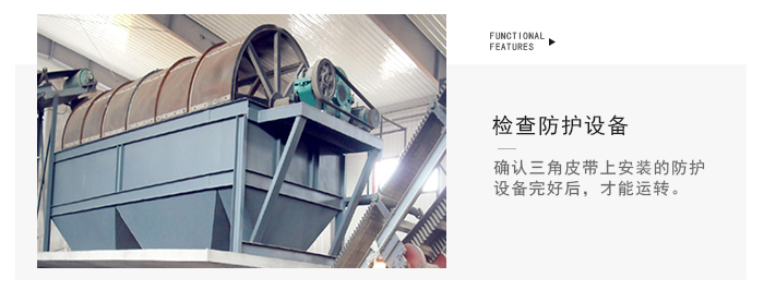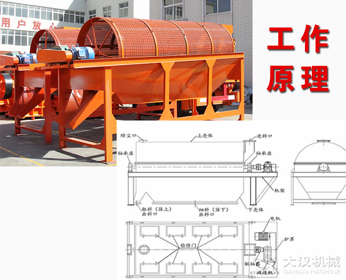 滾筒篩篩沙機主要由電機、減速機、滾筒裝置、機架、密封蓋、進料口、出料口等部分組成。滾筒裝置傾斜安裝于機架上。電動機經(jīng)減速機與滾筒裝置通過聯(lián)軸器連接在一起,驅(qū)動滾筒裝置繞其軸線轉(zhuǎn)動。當物料進入滾筒裝置后,由于滾筒裝置的傾斜與轉(zhuǎn)動,使篩面上的物料翻轉(zhuǎn)與滾動,使合格物料(篩下產(chǎn)品)經(jīng)滾筒后端底部的出料口排出,不合格的物料(篩上產(chǎn)品)經(jīng)滾筒尾部的排料口排出。由于物料在滾筒內(nèi)的翻轉(zhuǎn)、滾動,使卡在篩孔中的物料可被彈出,防止篩孔堵塞。