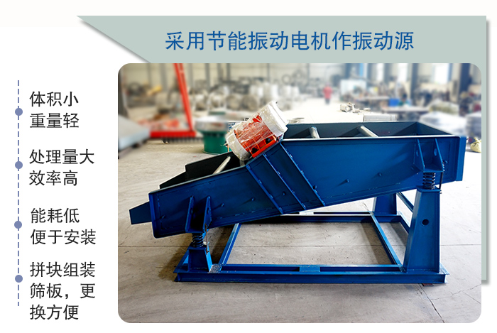 該產(chǎn)品 具有體積小、重量輕,能耗低、便于安裝及工藝布置等特點,采用振動電機作振動源,橡膠彈簧支撐并隔振,處理量大,篩分效率高,篩網(wǎng)有較大的安裝傾角,拼塊組裝篩板,更換方便,使用壽命長。